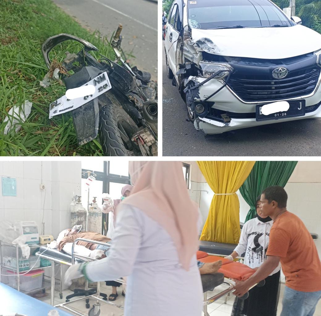 Mobil warna putih Toyota Avanza BL 1695 J dengan sepeda motor BL 3624 NM,di plat motor tertulis nama muammar.Kecelakaan ini diduga terjadi Adu kambing. Berlawan arah.